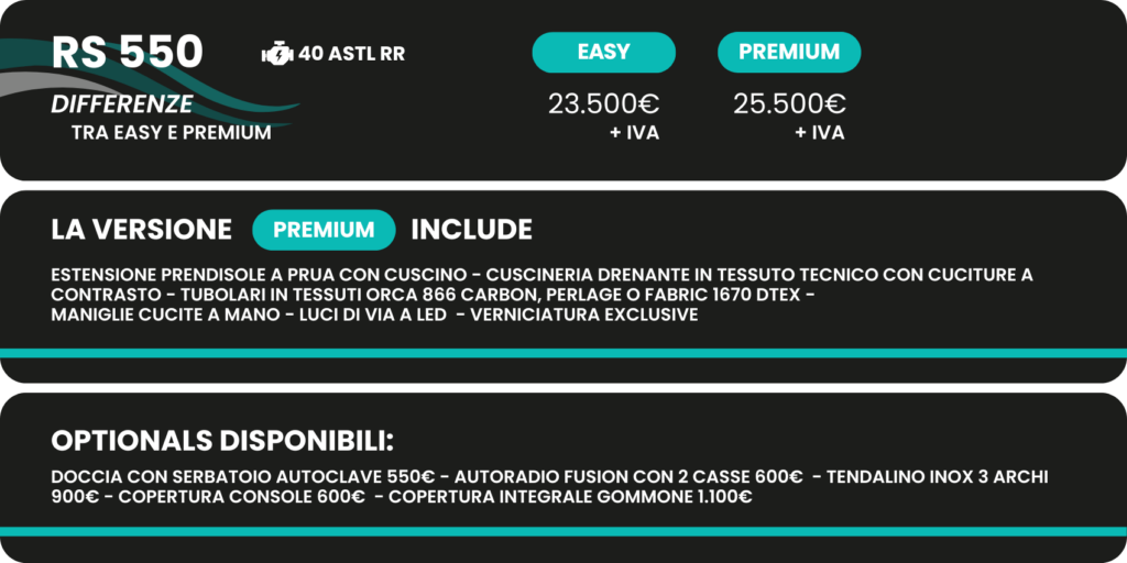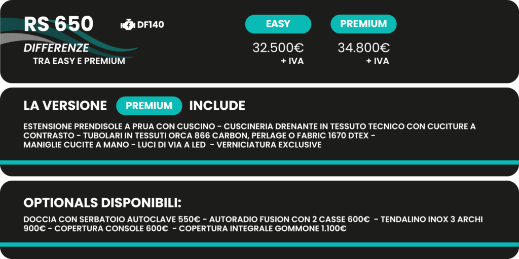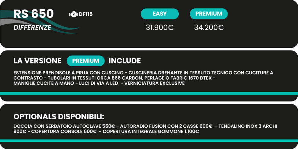 Scopri i gommoni RS Marine: eleganza, prestazioni e sicurezza in un design all’avanguardia, perfetti per chi cerca il massimo del comfort e della qualità nelle avventure in mare. Sono disponibili in 3 dimensioni per un totale di 9 combinazioni con motorizzazioni differenti, a seconda delle esigenze.